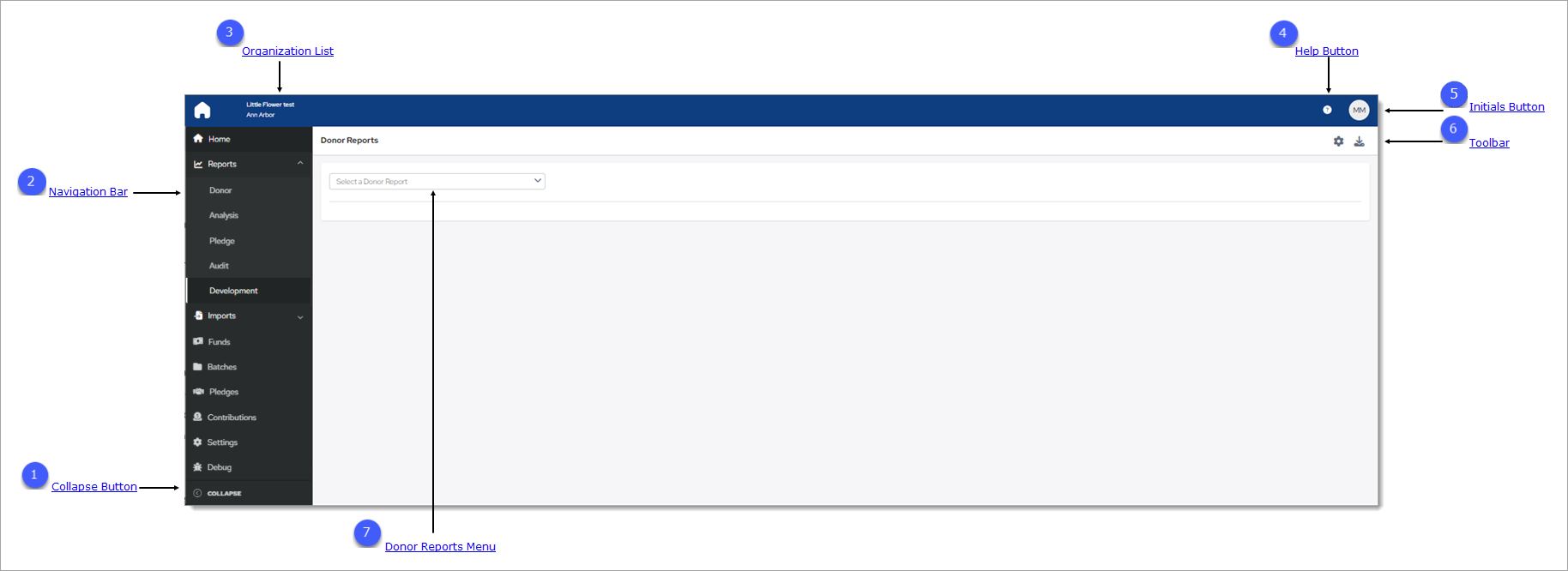 Navigation BarThe Navigation Bar is the menu that sits on left side of the Donor Reports page (and on every other page in the module). The menu lists the module's primary pages and provides a way for you to quickly move from one page to another. When you want to view a specific page's content, simply select the page option.