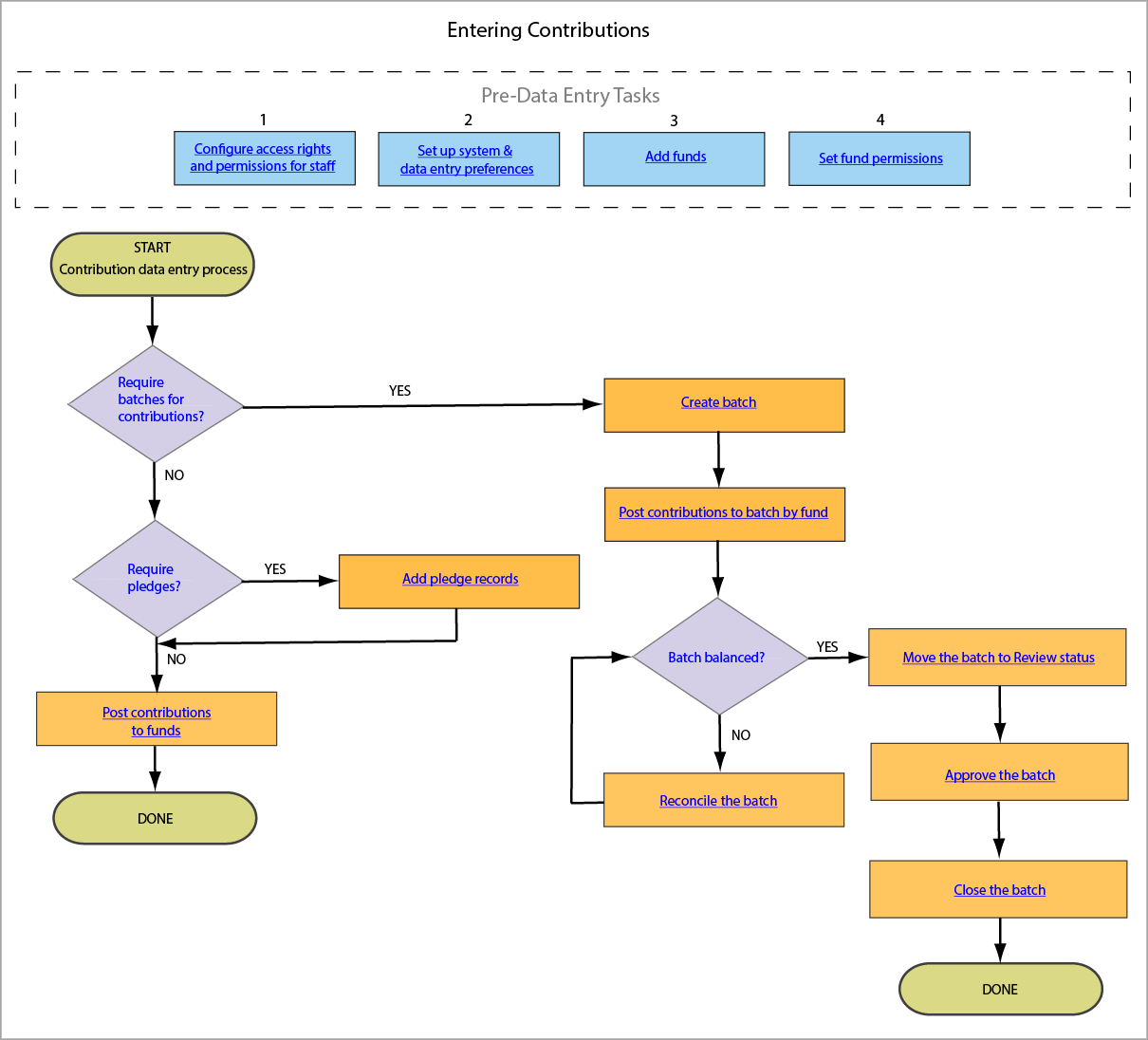 To get started, complete the pre-data entry tasks. Each rectangle contains a defined task or action. The task contains a link that, when clicked, takes you to a topic showing you how to complete it. After completing a task, return to the diagram and proceed to the next task. Continue in this manner until you complete the five tasks.