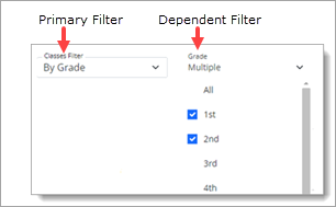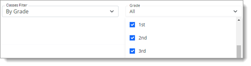 With the exception of the default option, each option in Classes Filter list is linked to secondary filters that display automatically to enable you to further narrow down your initial filter selection. By way of illustration, in the example below the By Grade option is initially selected in the Classes Filter dropdown. The system automatically displays a second dependent filter, Grade, that contains a list of options specific to the By Grade filter. The user can select Like the By Grade option, the By Session, By Department, and Selected Classes options each generate secondary filters with a dropdown list of choices you can select to narrow down the initial filter criteria. |