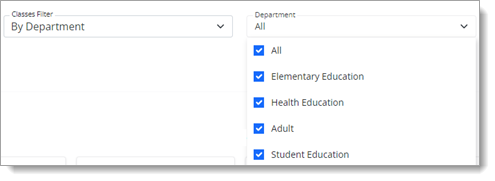This filter is a conditional or dependent filter linked to the selection made in Classes filter (see previous entry) dropdown list. When you select the By Department setting in the Classes Filter list, the system displays the Department dropdown list, which contains the departments configured for your program. In the list, select the department or departments to include in the report.
