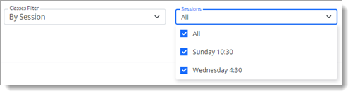 This filter is a conditional or dependent filter linked to the selection made in Classes filter (see previous entry) dropdown list. When you select the By Session setting in the Classes Filter list, the system displays the Sessions dropdown list, which contains the sessions configured for your program. In the list, select the session or sessions to include in the report.