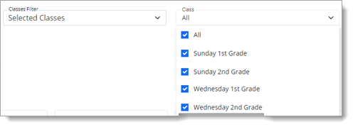 This filter is a conditional or dependent filter linked to the selection made in Classes filter (see previous entry) dropdown list. When you select the Selected Classes setting in the Classes Filter list, the system displays the Class dropdown list, which contains the classes configured for your program. In the list, select the class or classes to include in the report.